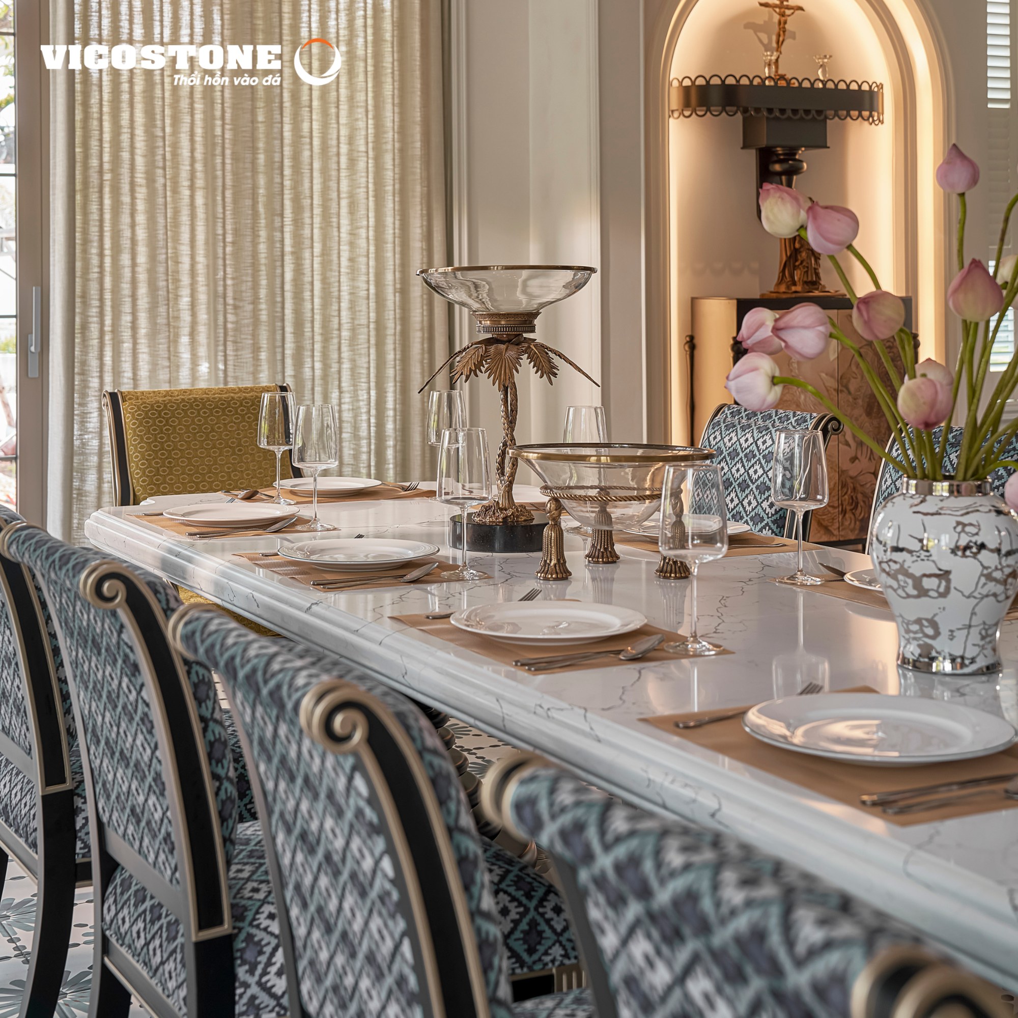 Bàn ăn với mặt đá trắng Vicostone tạo sự sang trọng và thẩm mỹ tuyệt đối