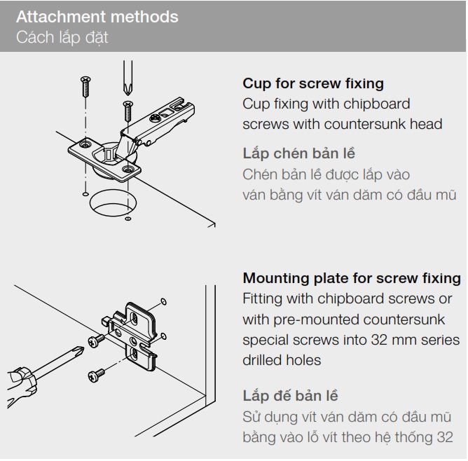Đế bản lề: Phần gắn vào thân tủ.