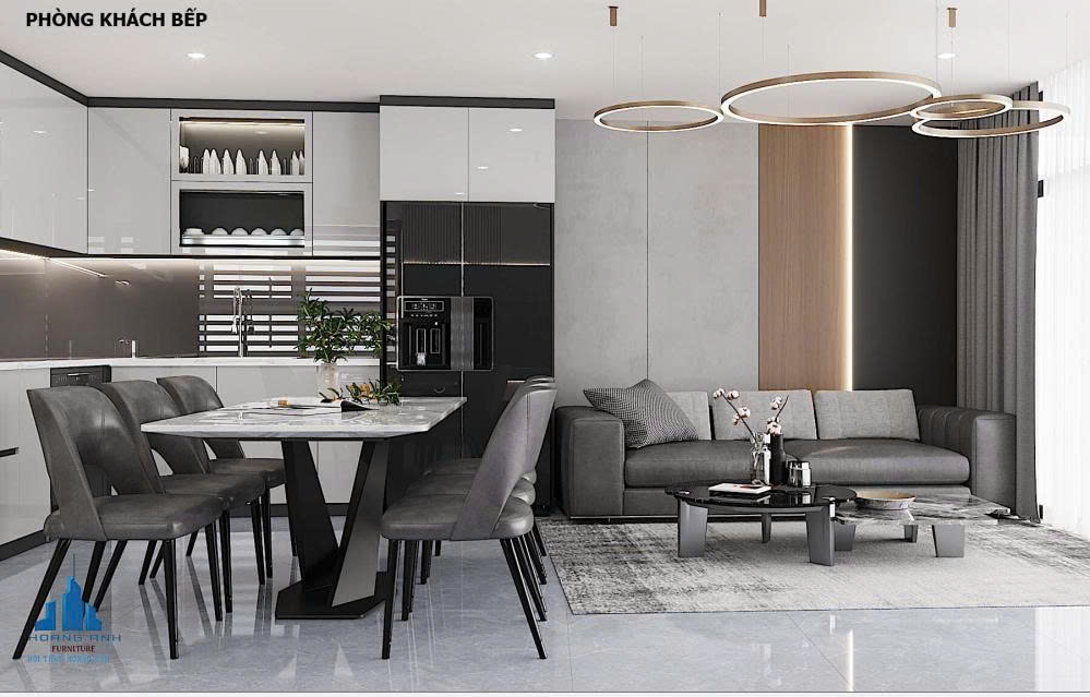 - Kết nối phòng khách, phòng ăn và bếp tạo cảm giác rộng rãi, thoáng đãng và tăng sự tương tác giữa các thành viên.
