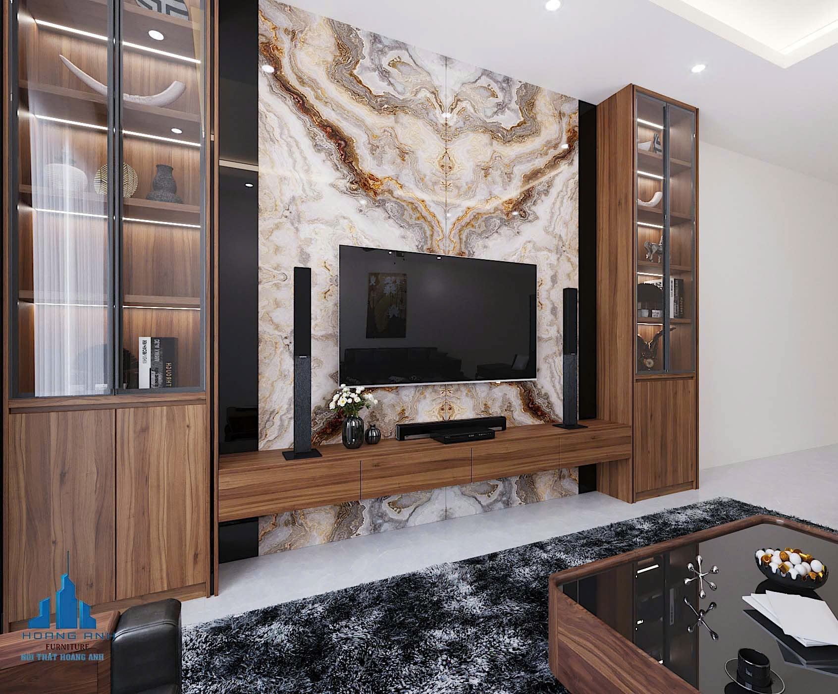 Phòng khách gọn gàng ngăn nắp với hệ vách và tủ trang trí và hệ ngăn kéo hiện đại