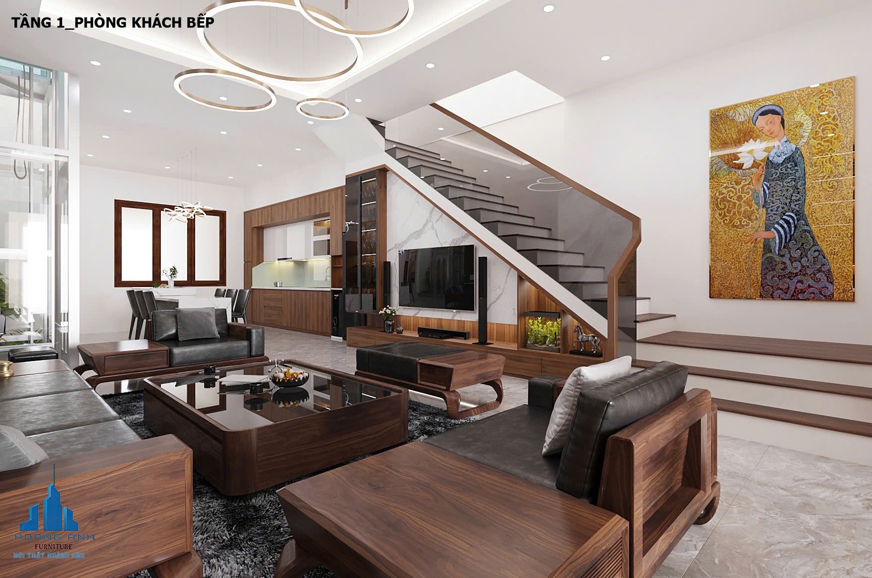 Sự kết hợp hoàn hảo giữa thiết kế phòng khách và phòng bếp tạo sự ấm cúng và rộng rãi