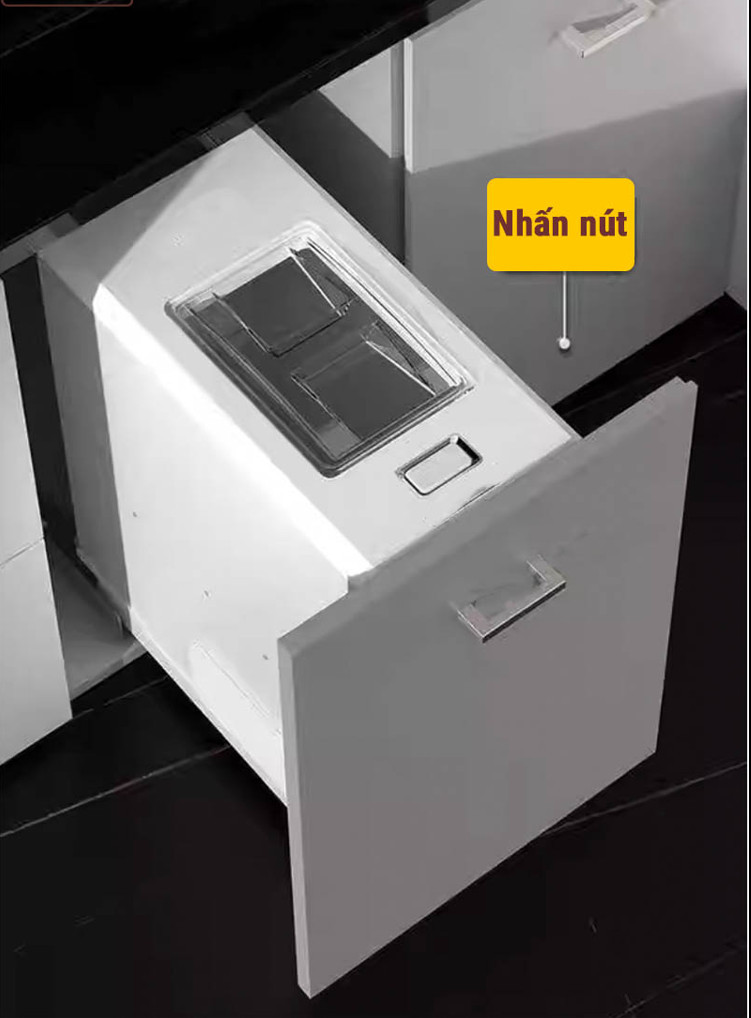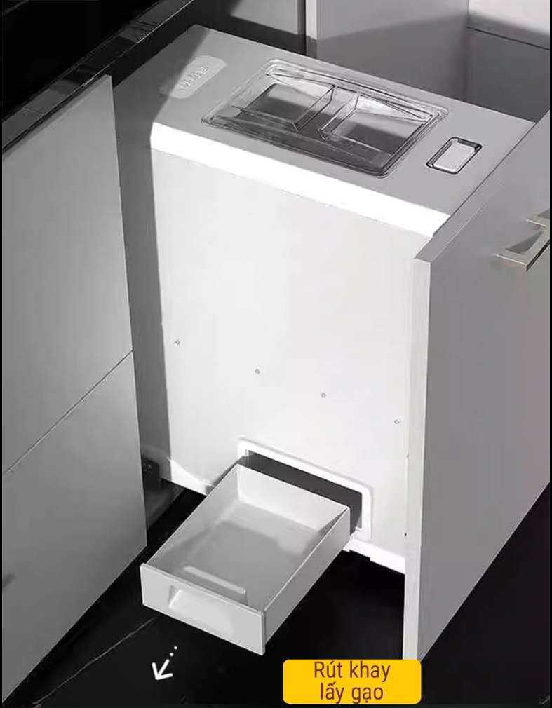 Thùng gạo nút nhấn được lắp đặt trong tủ bếp nên không gây mất mỹ quan như thùng đựng gạo thông thường và việc kéo thùng gạo ra vào cũng rất thuận tiện.